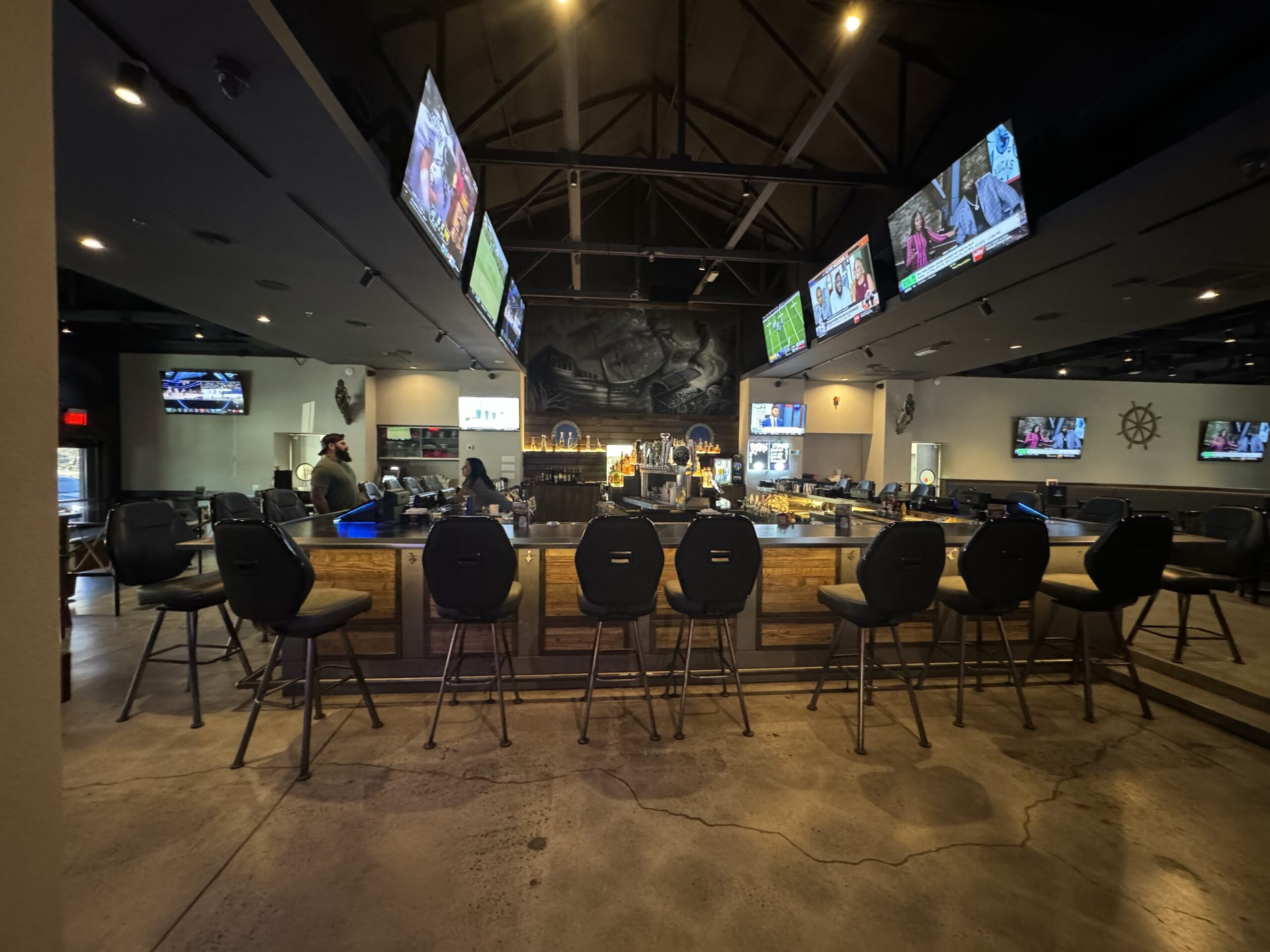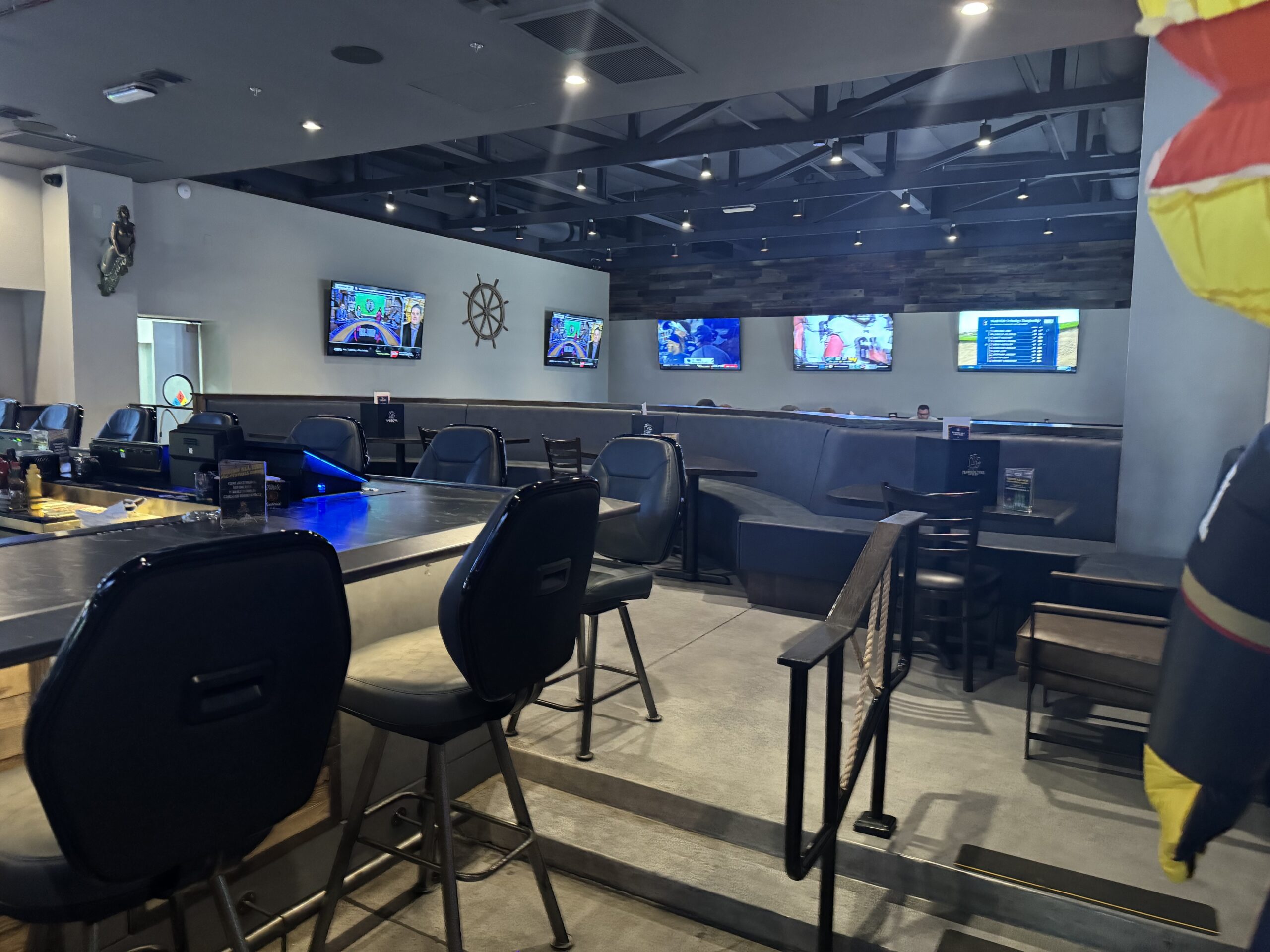 The interior remodel included the main dining area featuring the addition of booths and a new large seating area integrated into the bar for additional seating capacity. The entryway underwent a remodel that included porthole style windows imported from Poland, providing a unique view of the bar upon entering.
